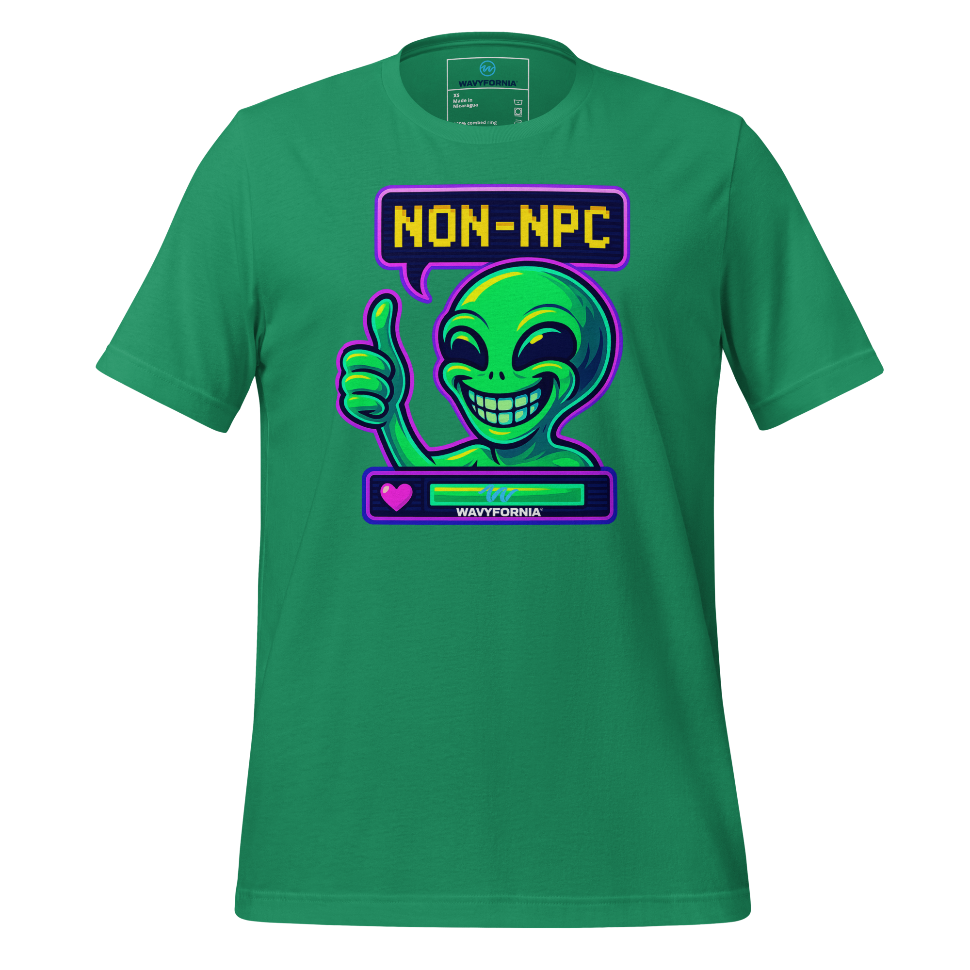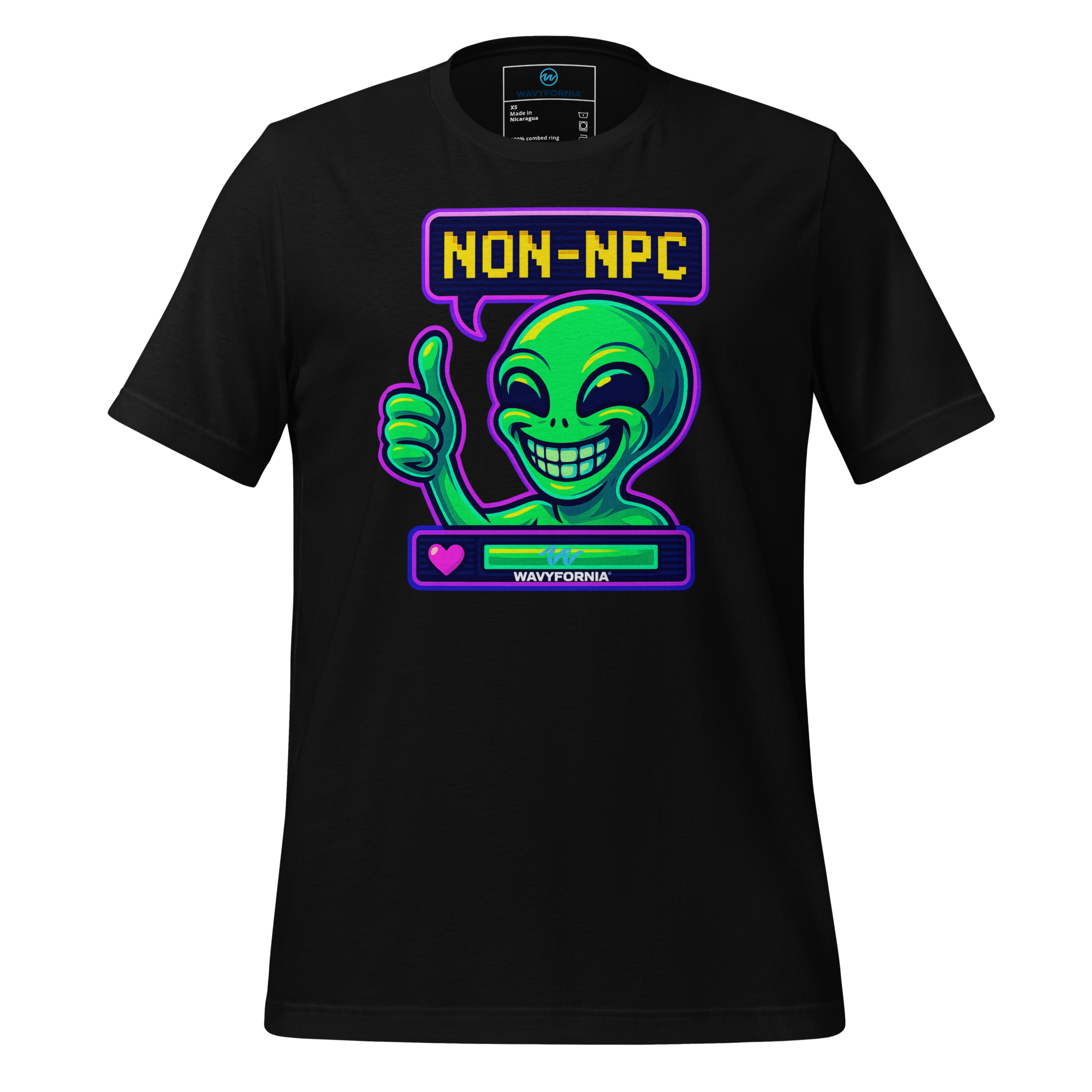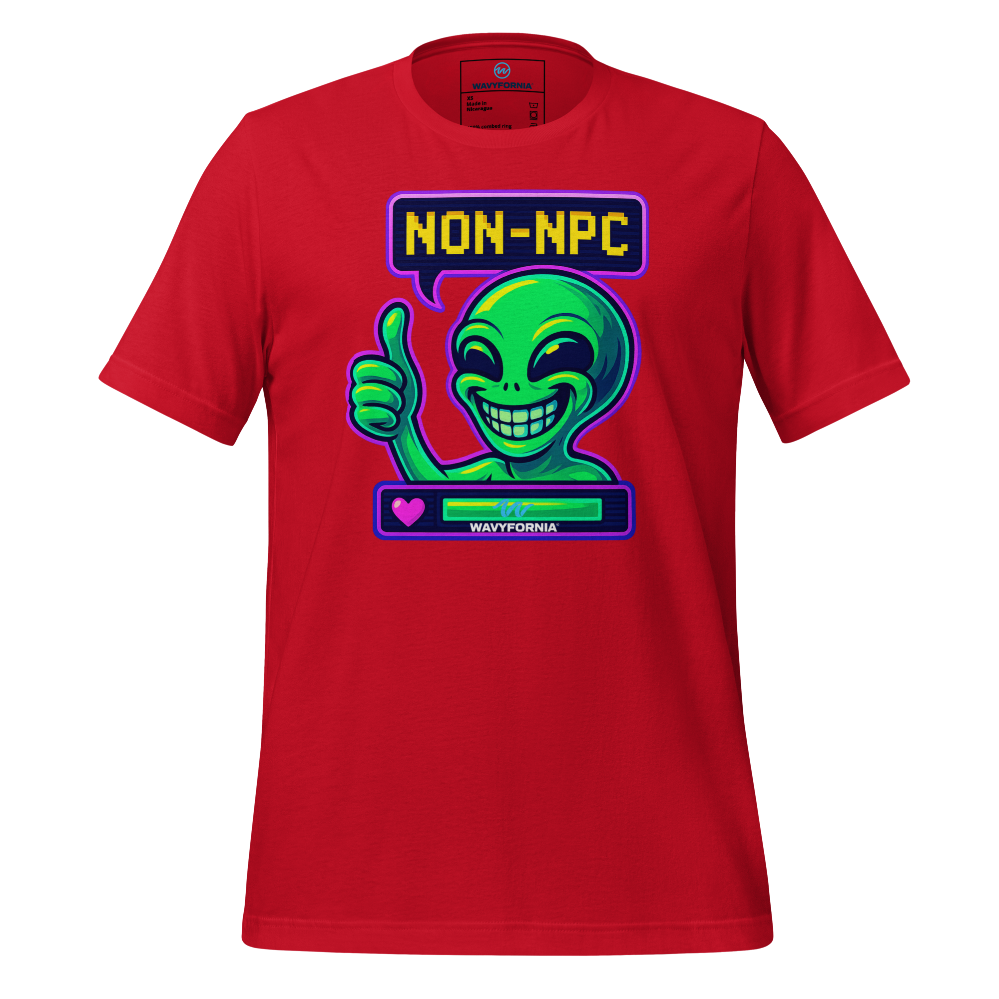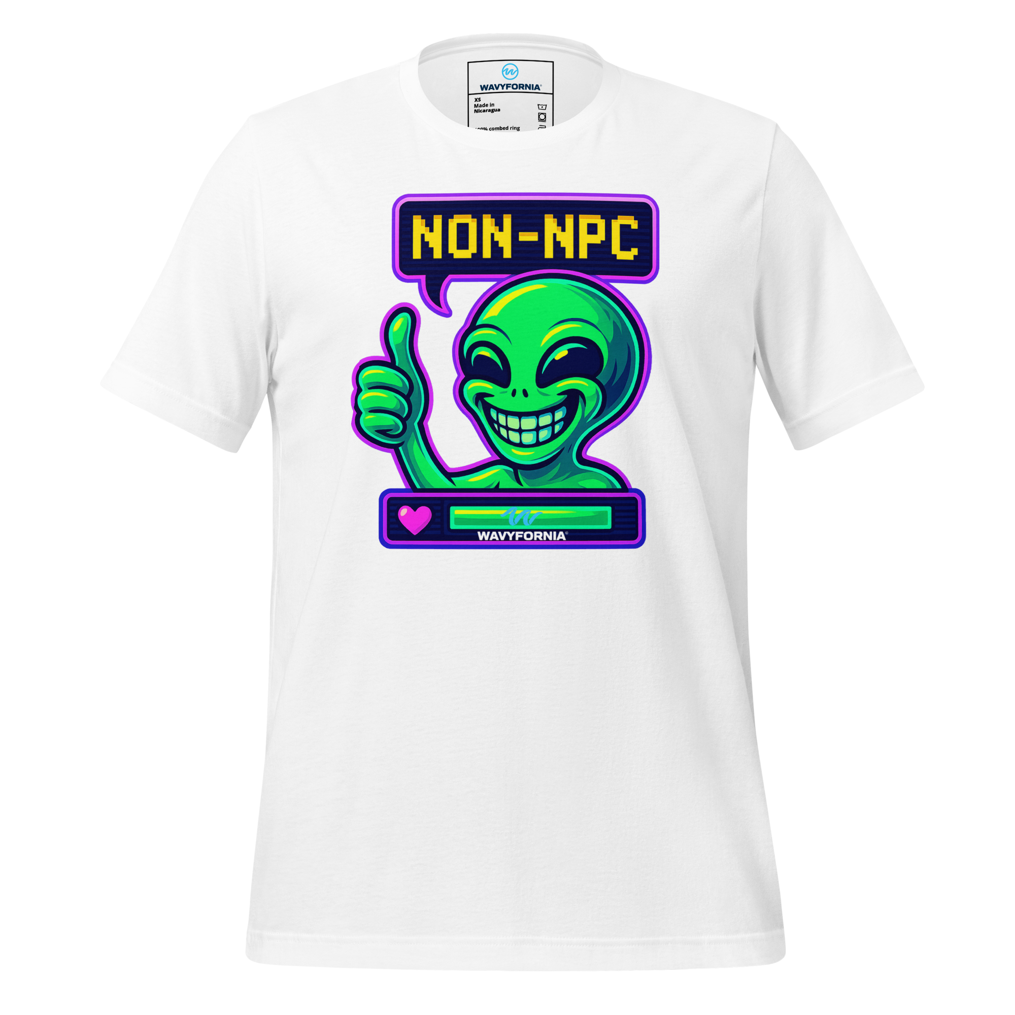 You weren’t made to follow the script. The Non-NPC T-Shirt by Wavyfornia features a wildly expressive alien grinning ear to ear, here to remind the world that you’re anything but background. This tee celebrates individuality, absurdity, and the joy of being fully, unapologetically you.