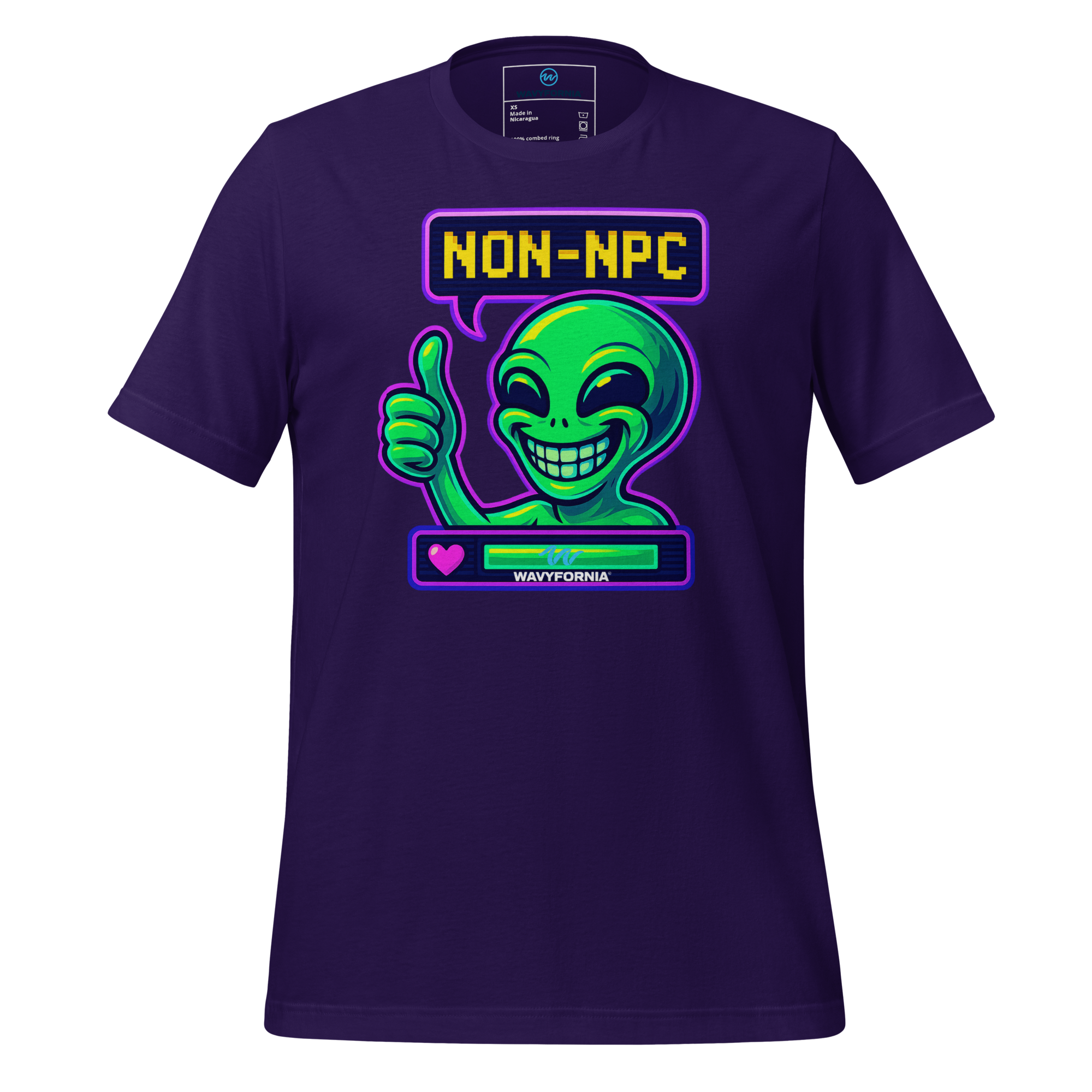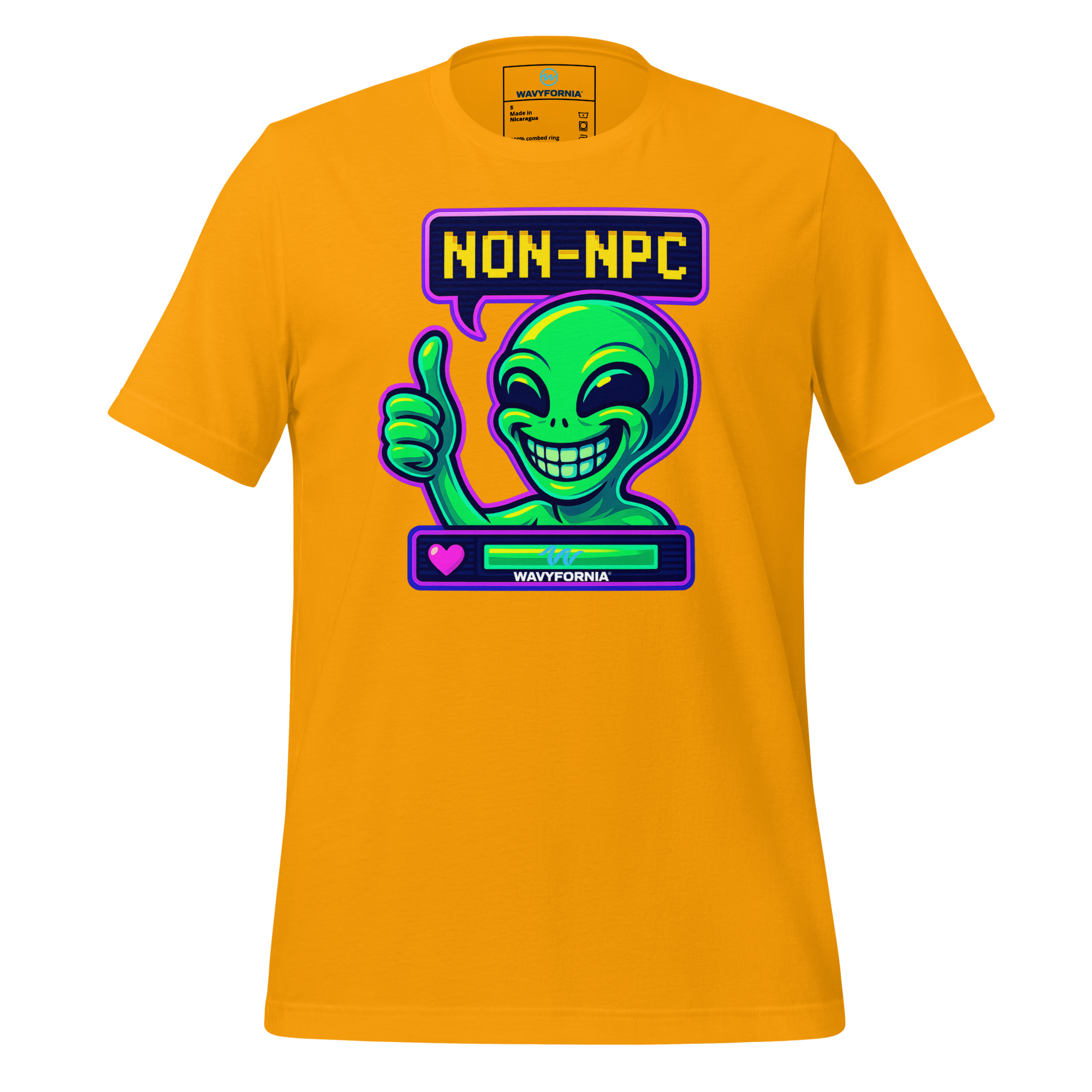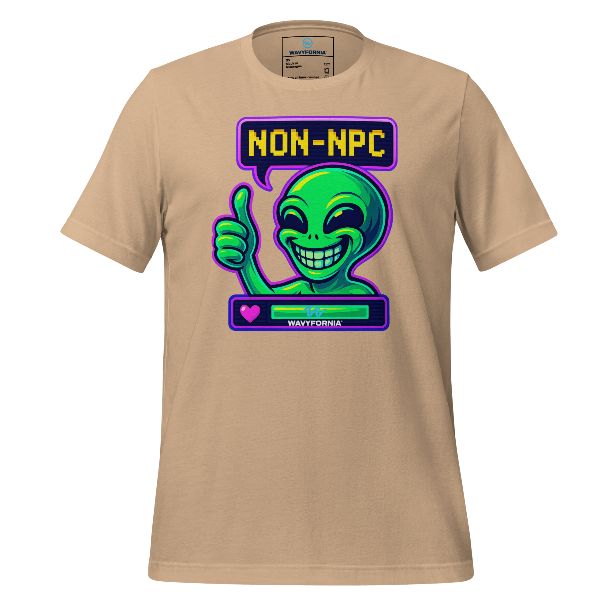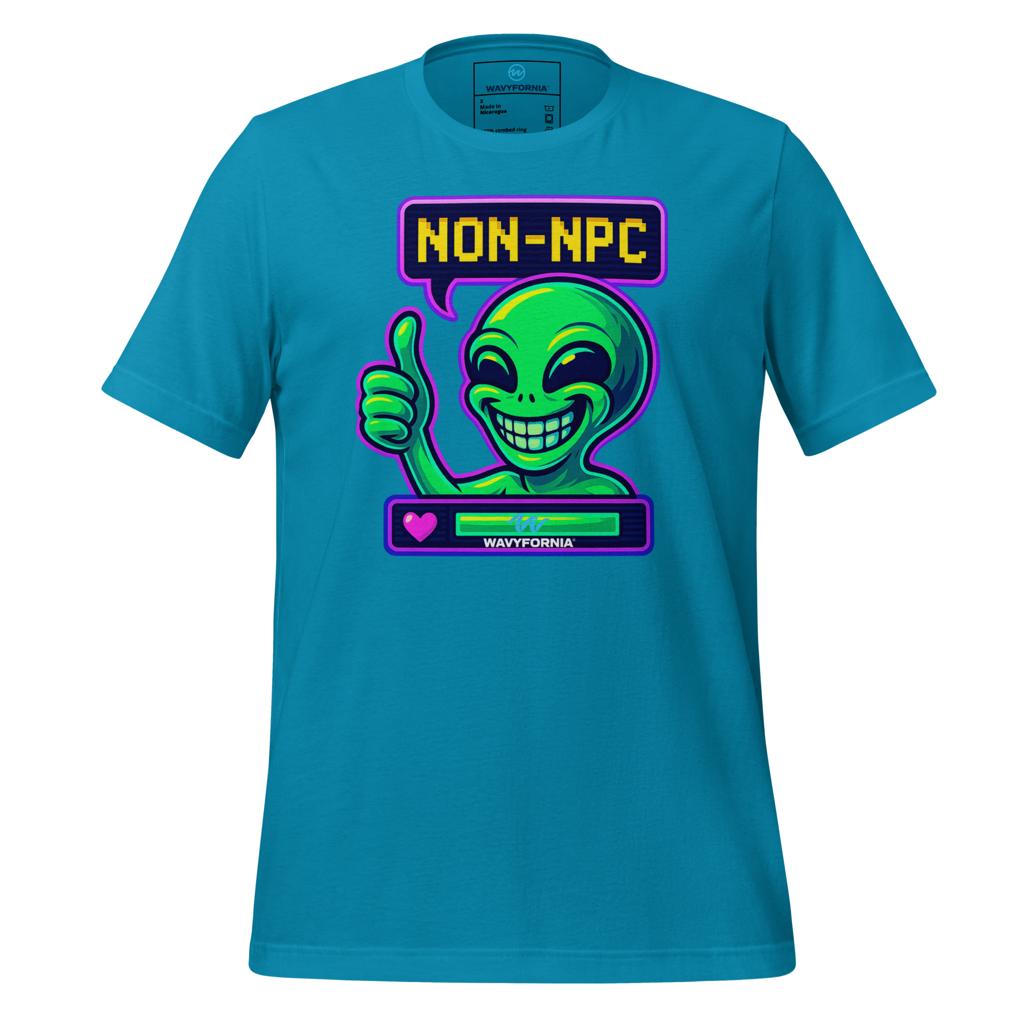 You weren’t made to follow the script. The Non-NPC T-Shirt by Wavyfornia features a wildly expressive alien grinning ear to ear, here to remind the world that you’re anything but background. This tee celebrates individuality, absurdity, and the joy of being fully, unapologetically you.