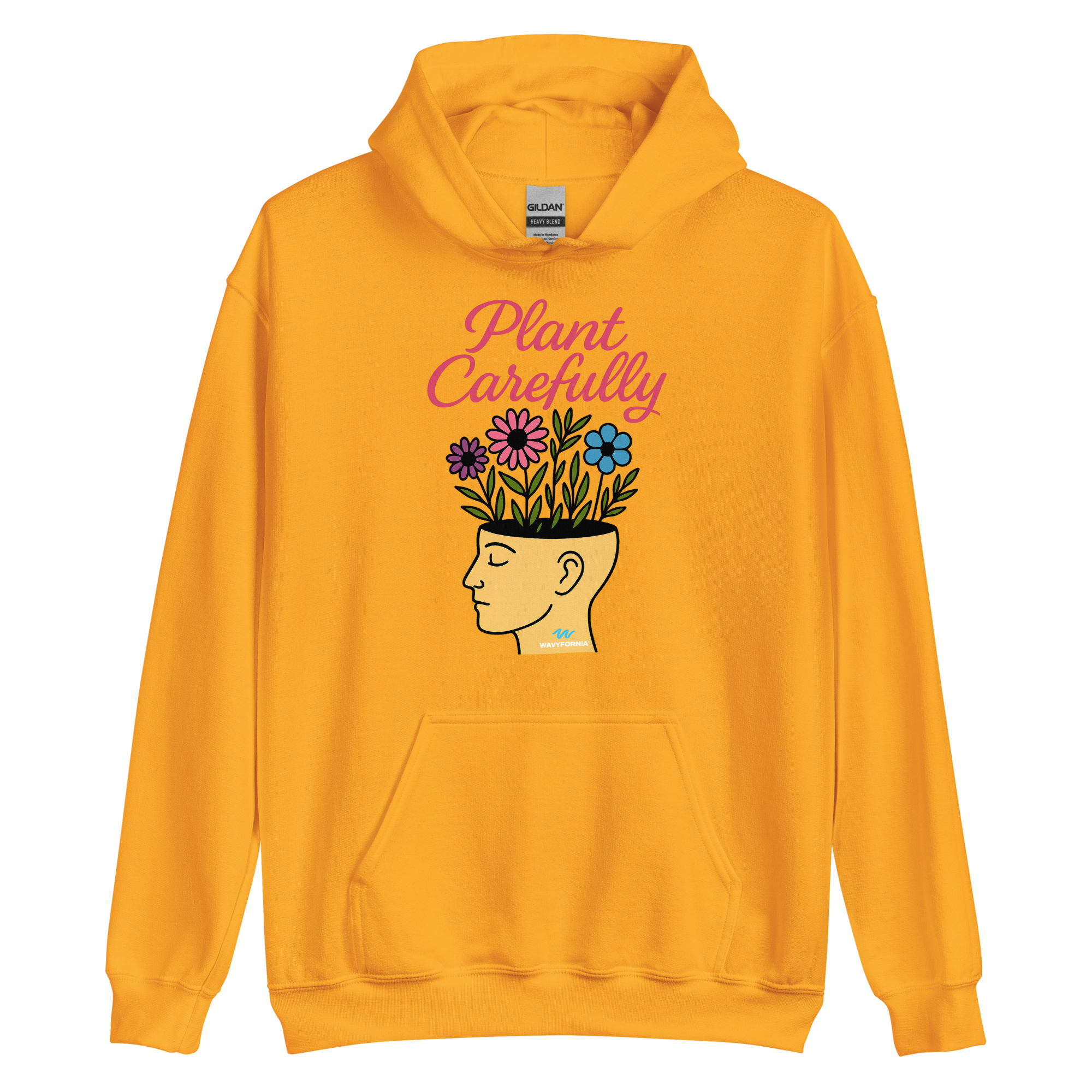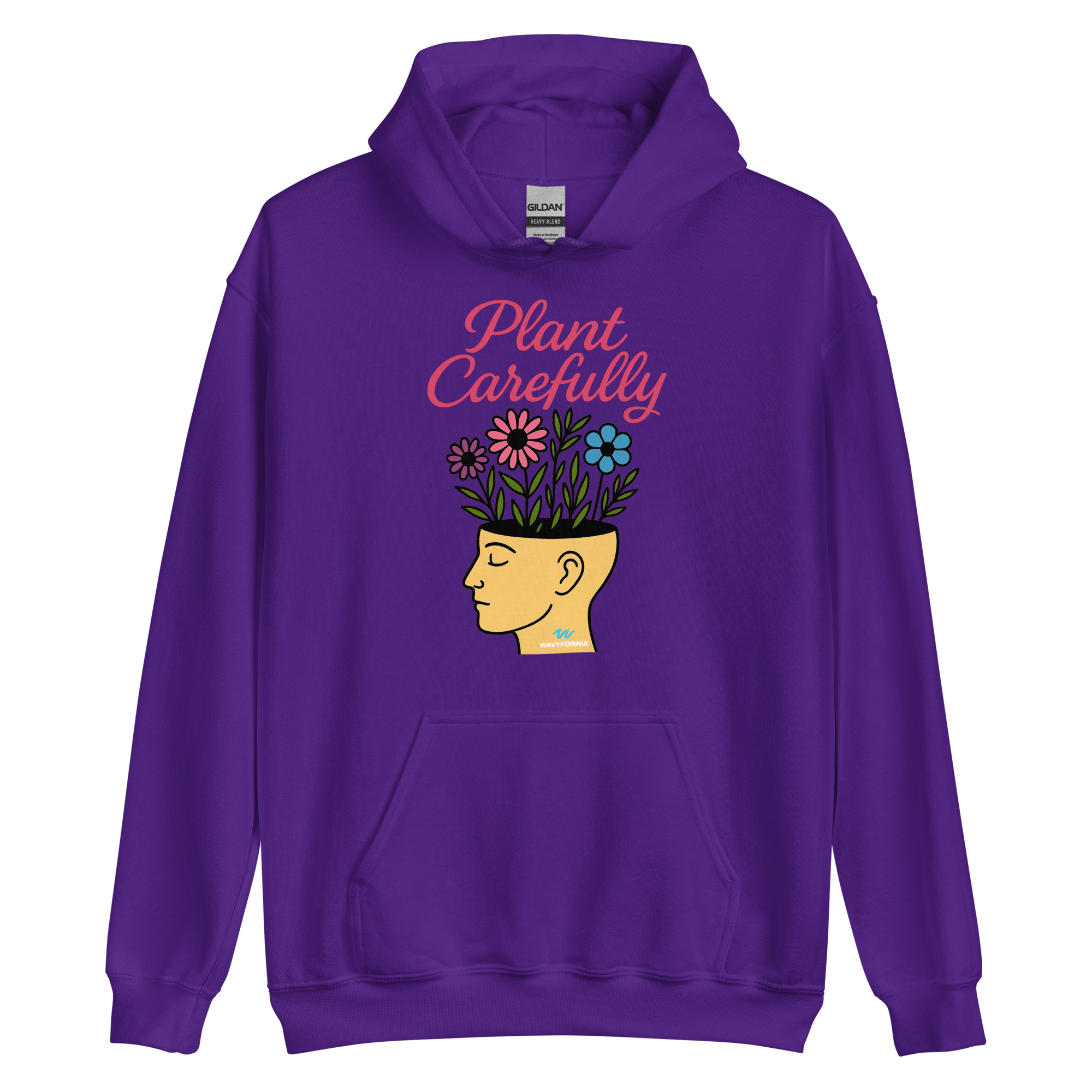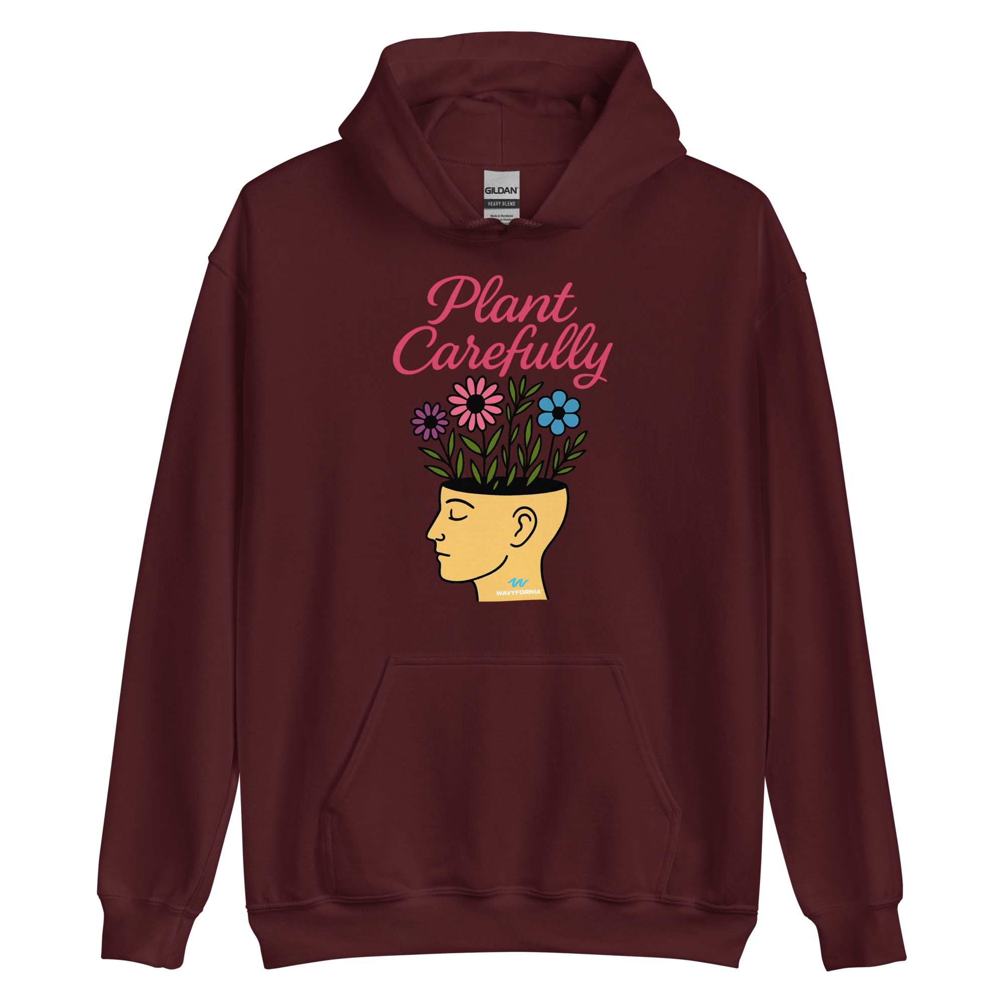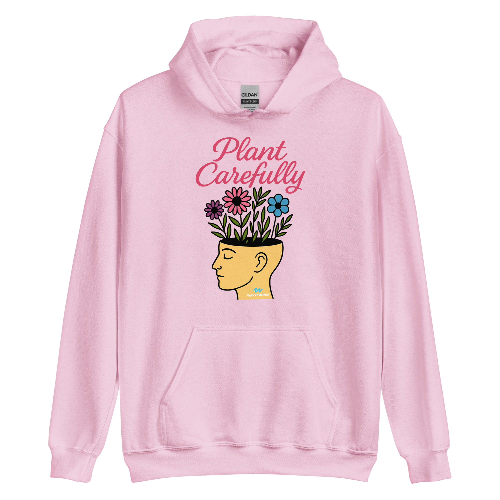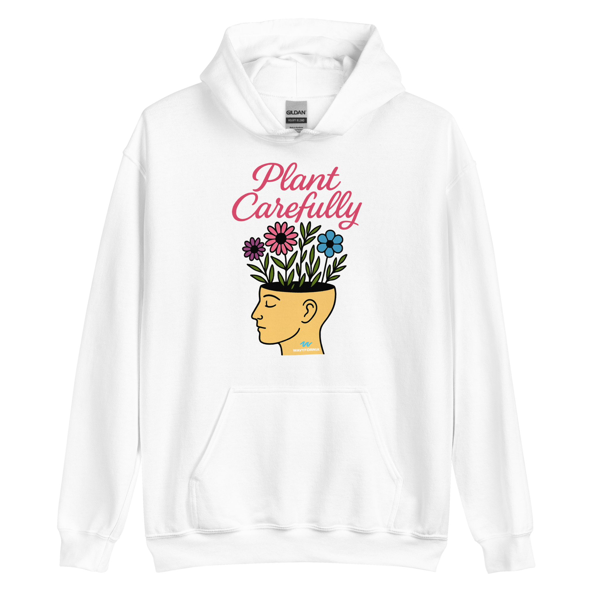 Your mind is a garden — tend to it with care. The Plant Carefully Hoodie by Wavyfornia features a unisex human head with flowers growing from it, symbolizing the beauty that blooms from intentional thoughts, rest, and self-kindness.