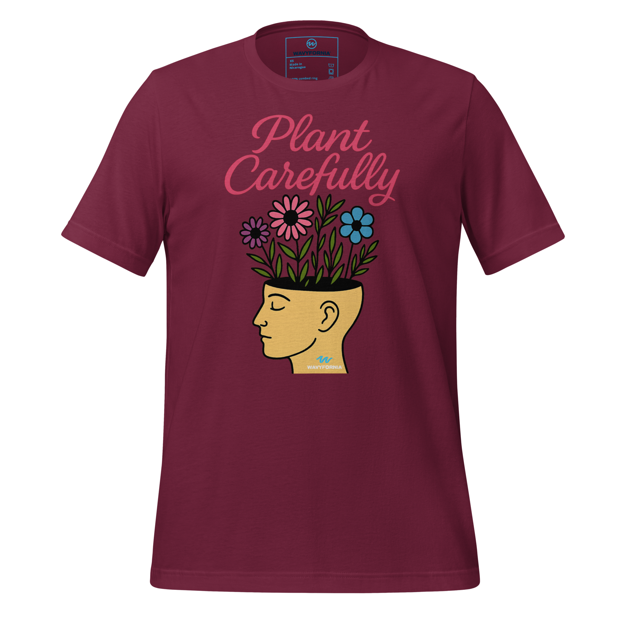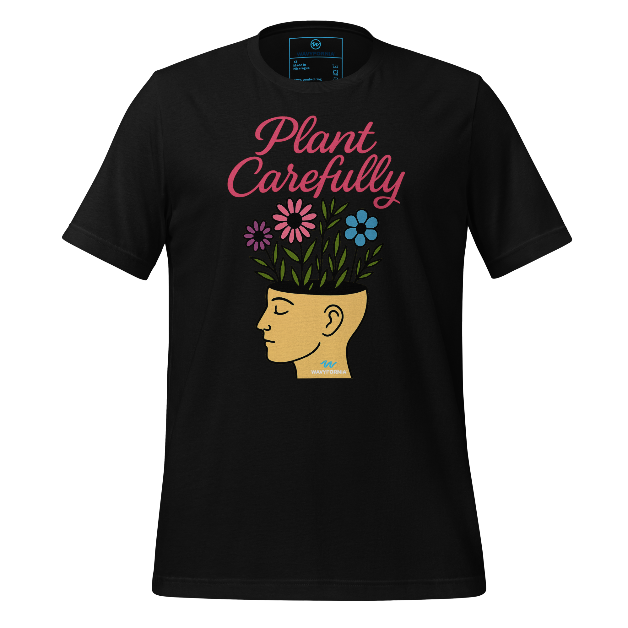 Your mind is a garden — tend to it with care. The Plant Carefully T-Shirt by Wavyfornia features a unisex human head with flowers growing from it, symbolizing the beauty that blooms from intentional thoughts, rest, and self-kindness.
