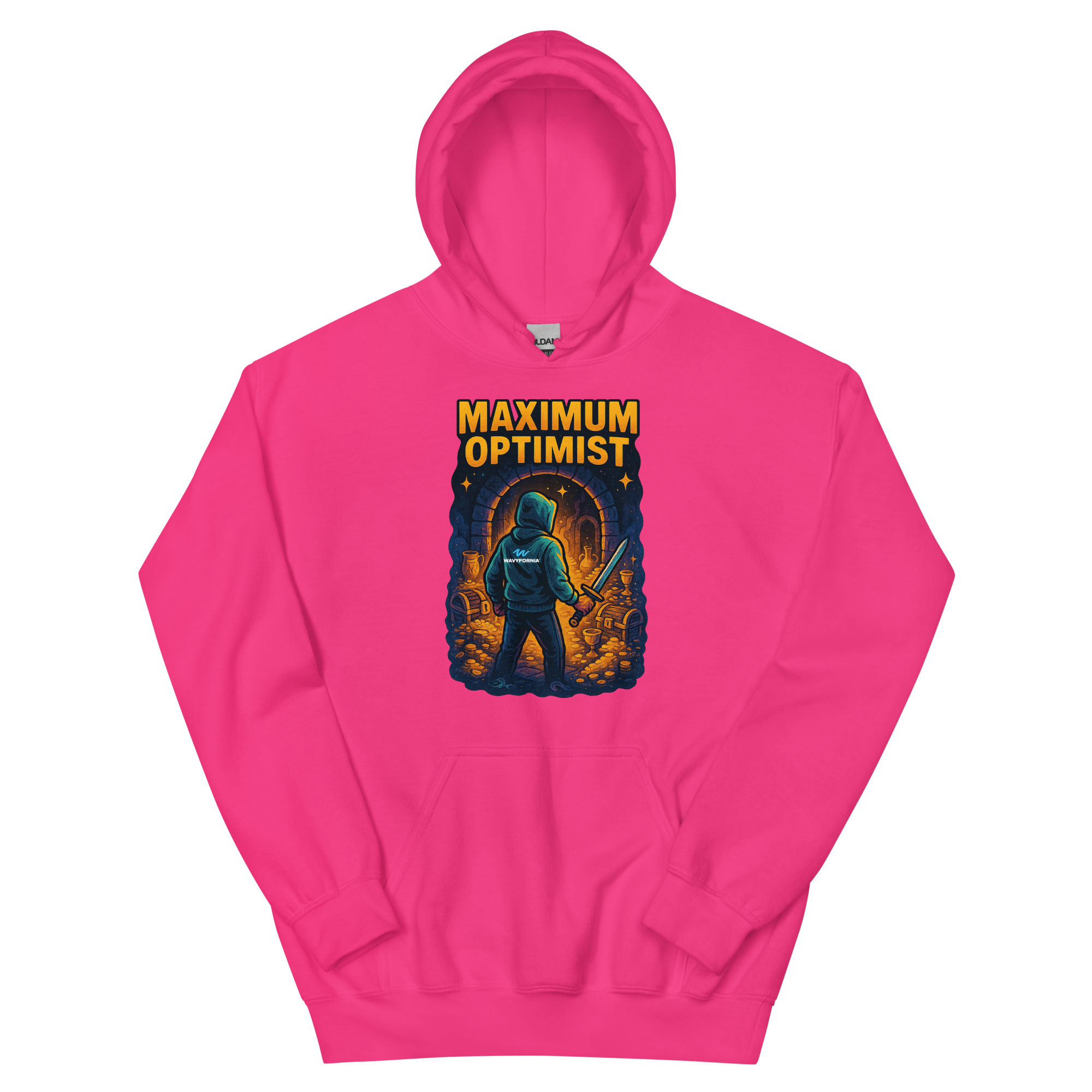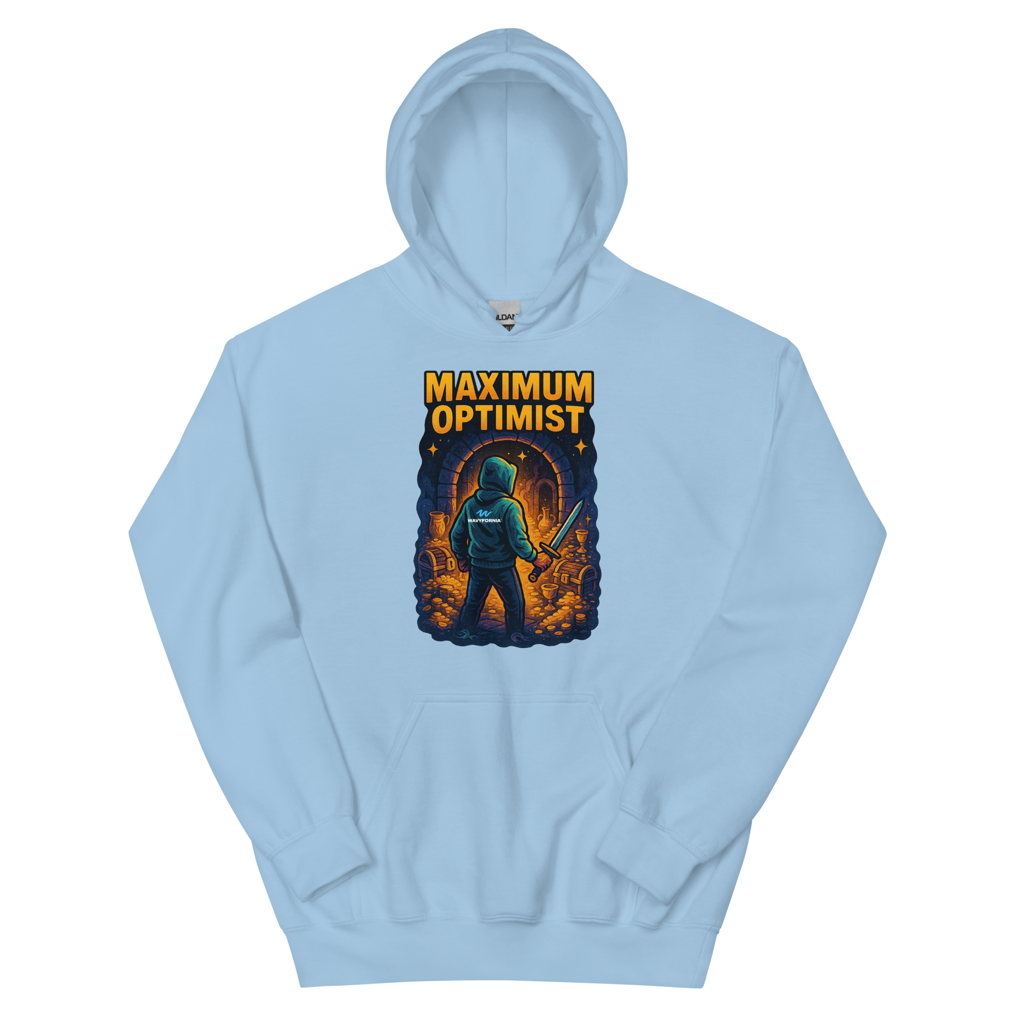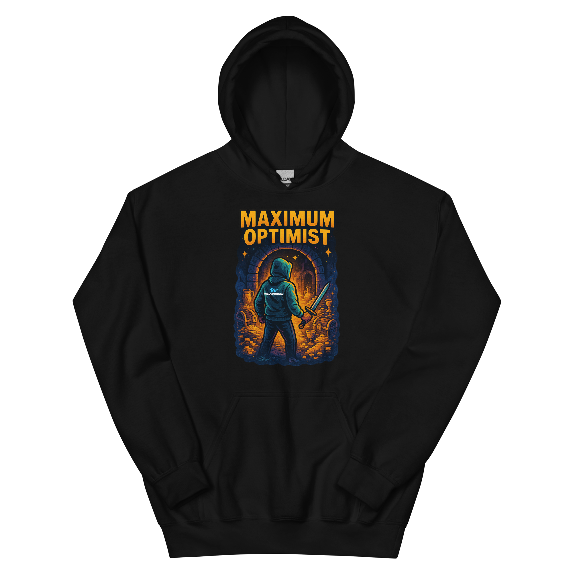 Optimism doesn’t mean ignoring the darkness — it means walking straight into it, hoodie on, sword in hand, eyes on the treasure. The Maximum Optimist Hoodie by Wavyfornia features a striking scene: an unknown figure clad in a Wavyfornia hoodie, carrying a broadsword, approaching the glowing threshold of a dungeon treasure room.