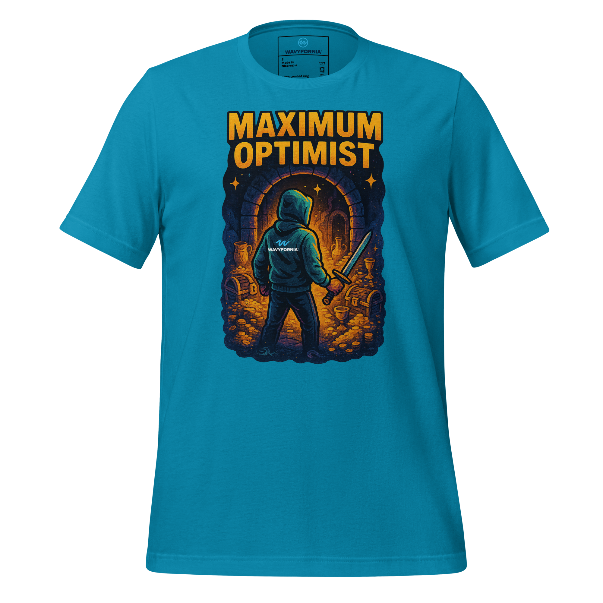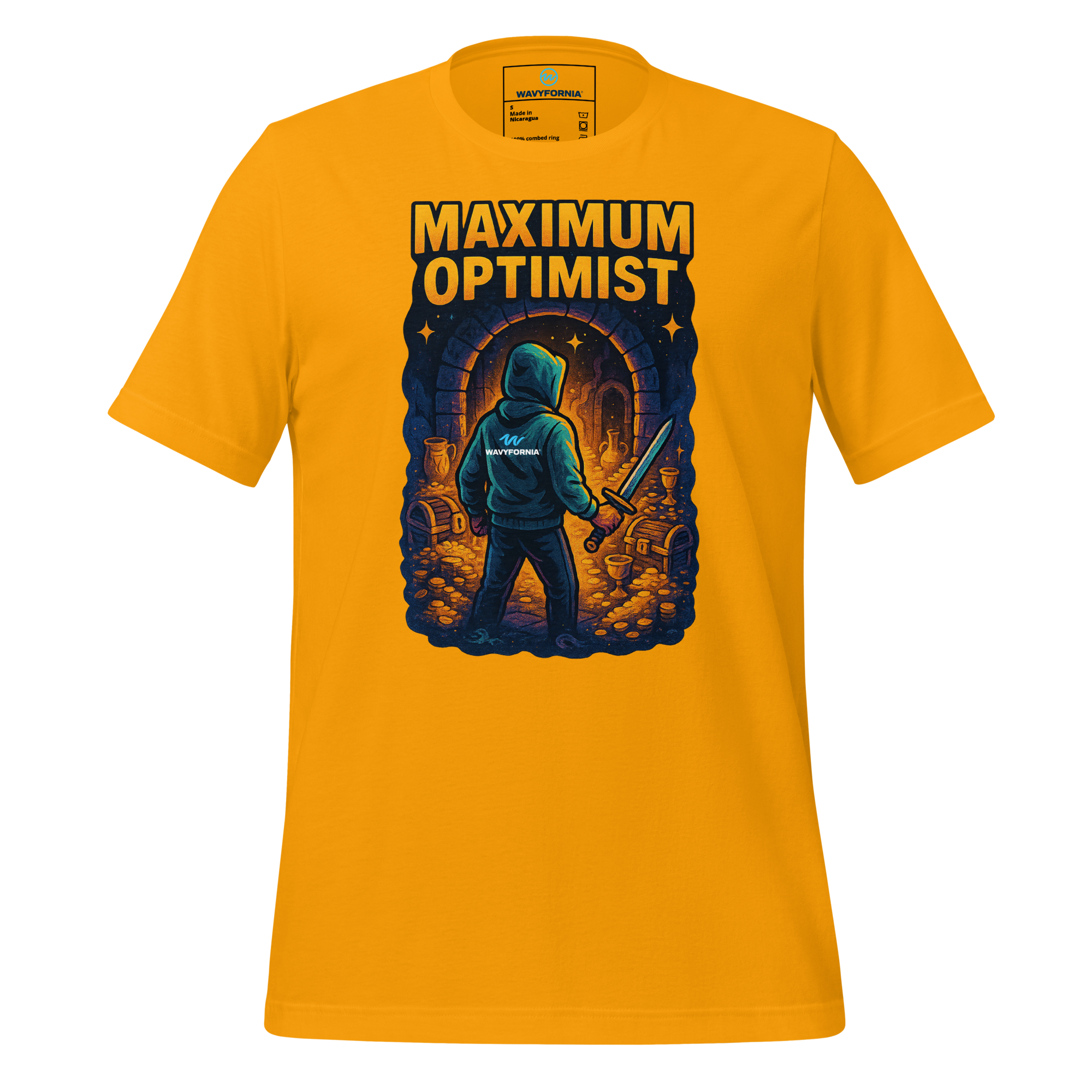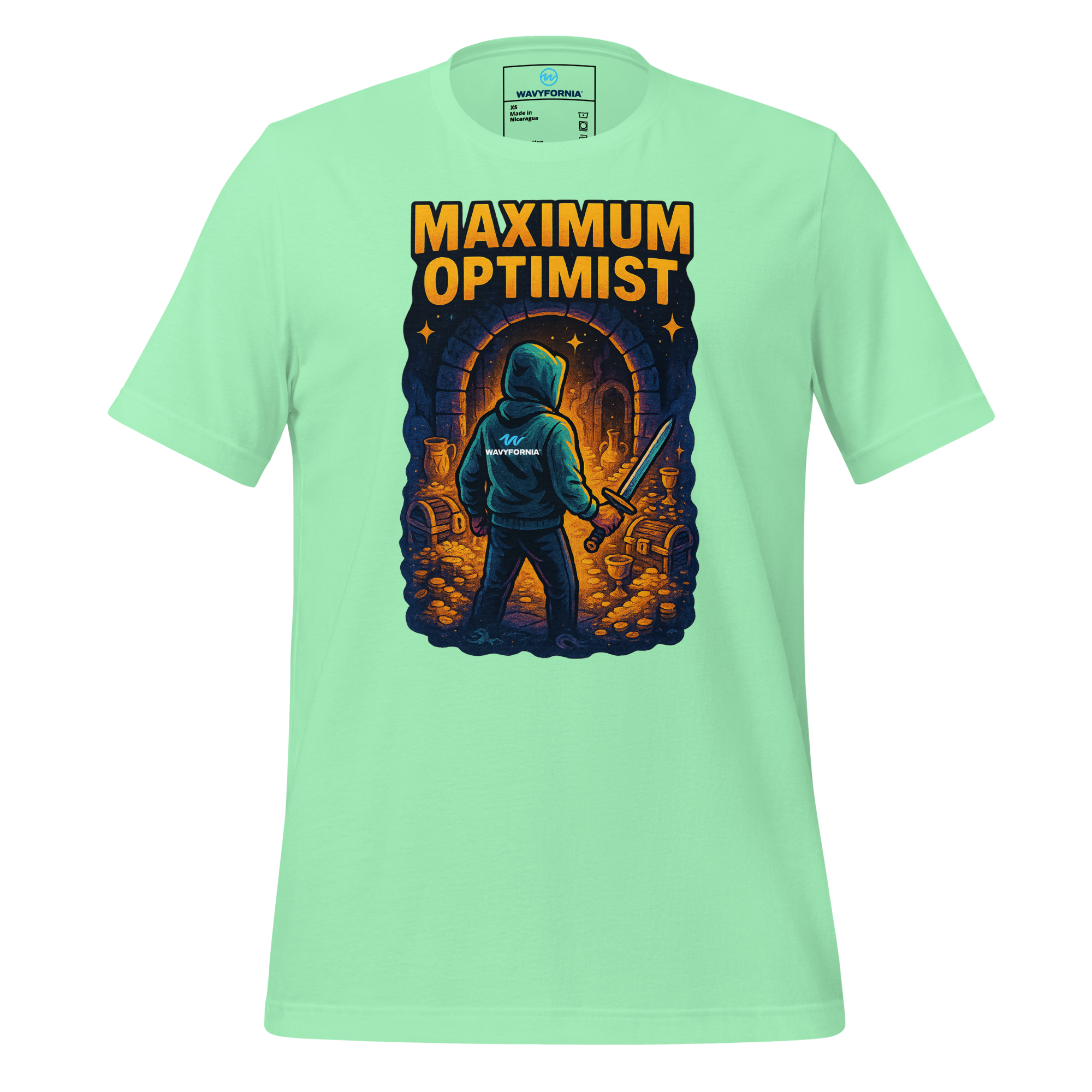 Optimism doesn’t mean ignoring the darkness — it means walking straight into it, hoodie on, sword in hand, eyes on the treasure. The Maximum Optimist T-Shirt by Wavyfornia features a striking scene: an unknown figure clad in a Wavyfornia hoodie, carrying a broadsword, approaching the glowing threshold of a dungeon treasure room.