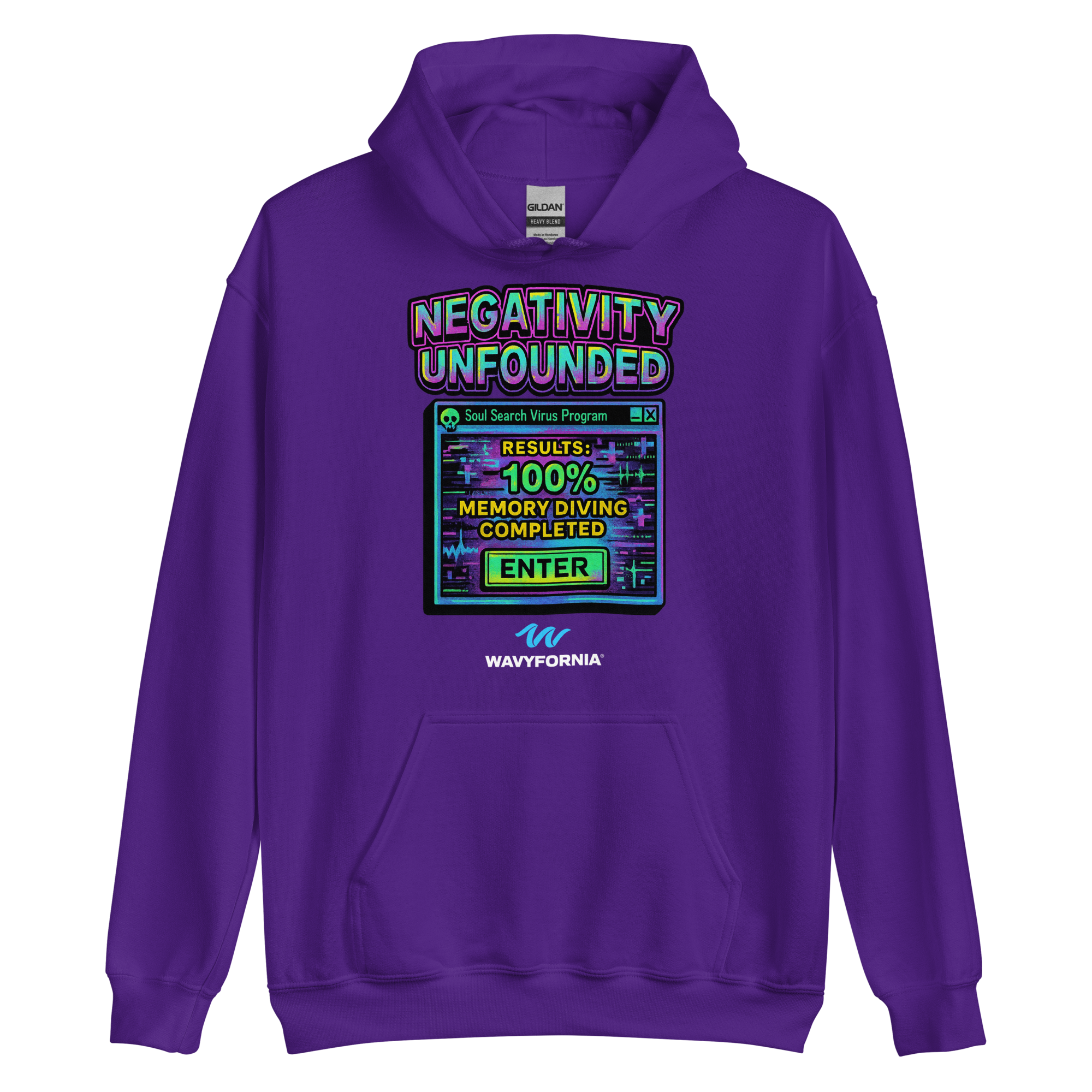 The search is complete — and the results are in: no negativity detected. The Negativity Unfounded Hoodie by Wavyfornia features a surreal, digital-age twist on self-reflection — a pop-up window from a fictional “Soul Search” virus scan, returning clean, peaceful results.