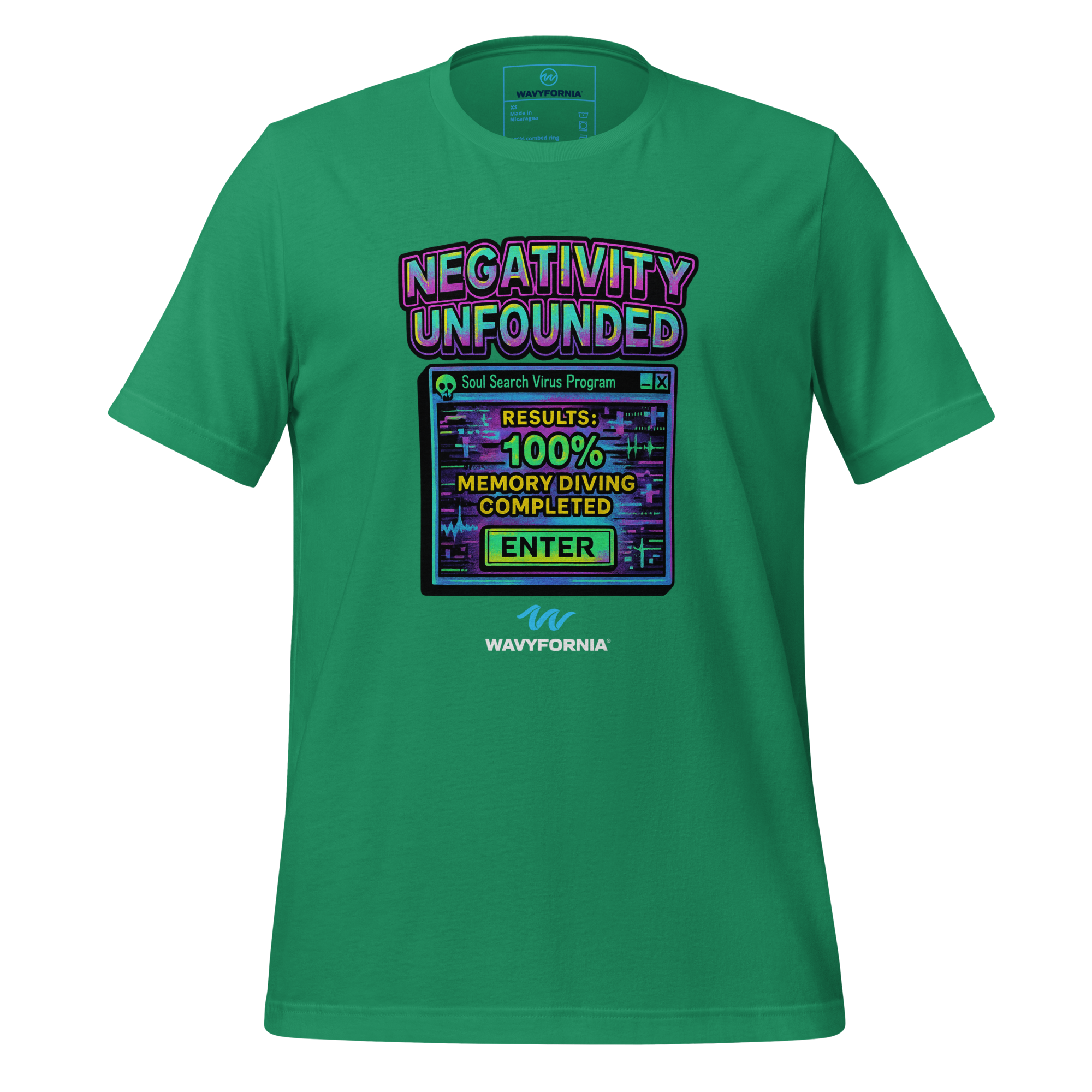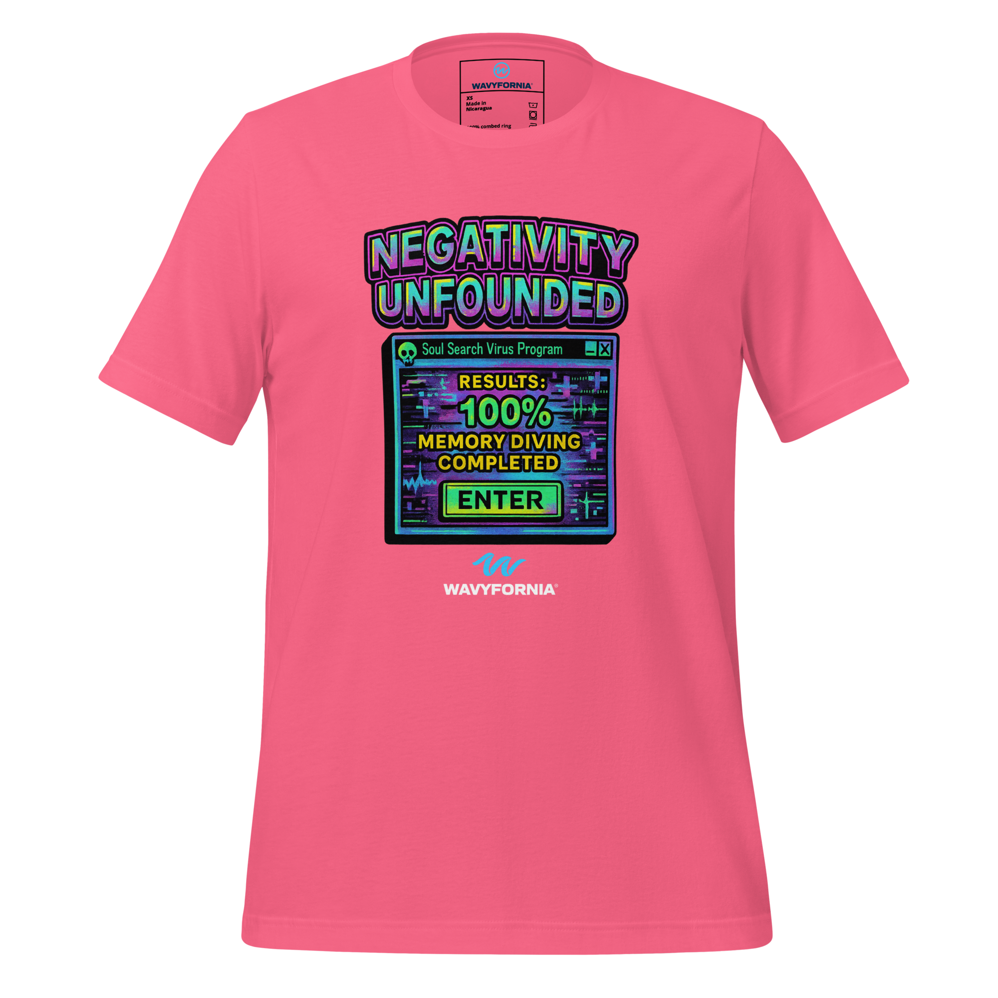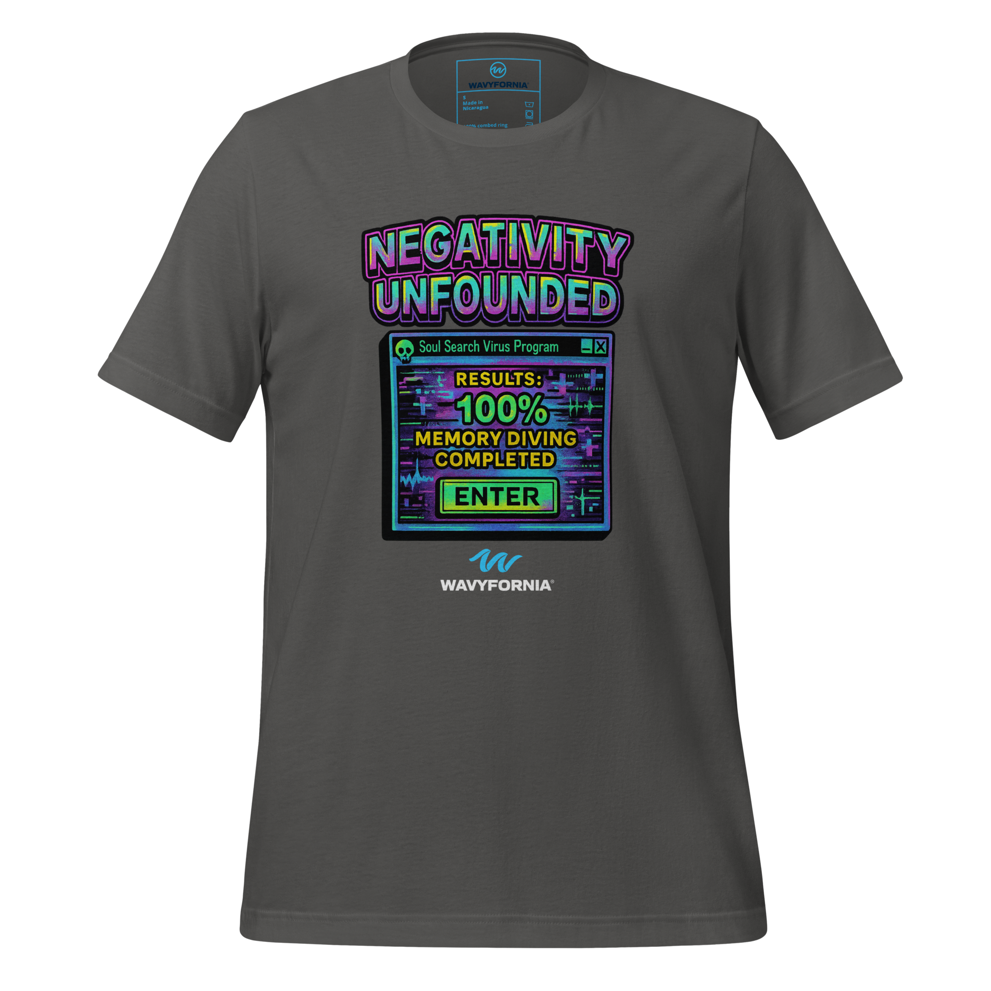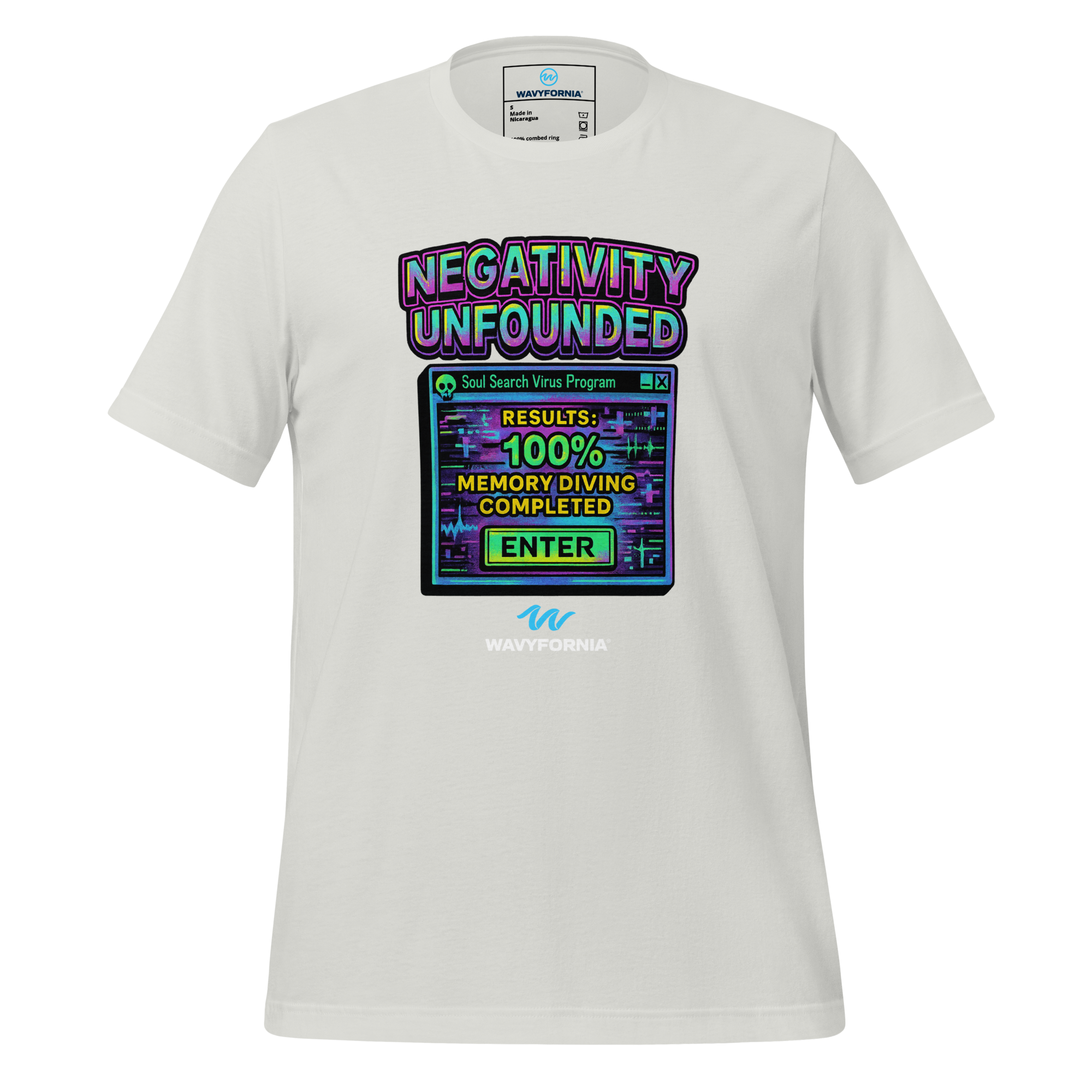 The search is complete — and the results are in: no negativity detected. The Negativity Unfounded T-Shirt by Wavyfornia features a surreal, digital-age twist on self-reflection — a pop-up window from a fictional “Soul Search” virus scan, returning clean, peaceful results.